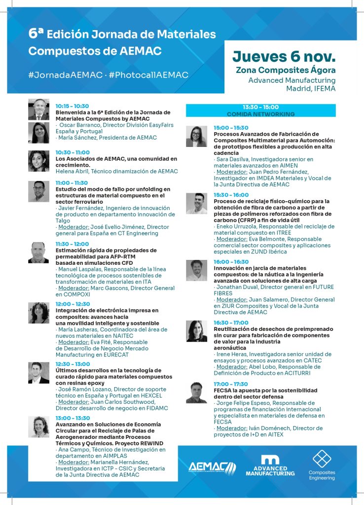 En esta edición participarán Asociados de AEMAC procedentes de la industria y la academia. Tras la bienvenida que correrá a cargo de la nueva Presidenta de AEMAC, María Sánchez, Catedrática en la Universidad Rey Juan Carlos y el Director de EasyFairs para España y Portugal, Oscar Barranco, se presentará la ponencia «Los Asociados de AEMAC, una comunidad en crecimiento» por Helena Abril, Técnico de Dinamización. A continuación, los asociados presentarán sus últimos desarrollos tecnológicos en el campo de los materiales compuestos, con la participación de la industria, de la mano de Javier Fernández de Talgo, moderado por José Evelio de CT Ingenieros, José Ramón Lozano de HEXCEL, moderado por Juan Carlos Southwood de FIDAMC, Eneko Urruzola de ITree, moderado por Eva Belmonte de ZUND Ibérica, Jonathan Duval de FUTURE FIBRES, moderado por Juan Salamero de ZIUR Composites y Jorge Felipe Espeso de FECSA, moderado por Iván Doménech de AITEX, y Airbus. Y desde la academia, con Manuel Laspalas de ITA, moderado por Marc Gascons de COMPOXI, María Lasheras de NAITEC, moderada por Eva Fité de EURECAT, Sara Dasilva de AIMEN, moderada por Juan Pedro Fernández de IMDEA Materiales e Irene Heras de CATEC moderada por Albel Lobo de ACITURRI.