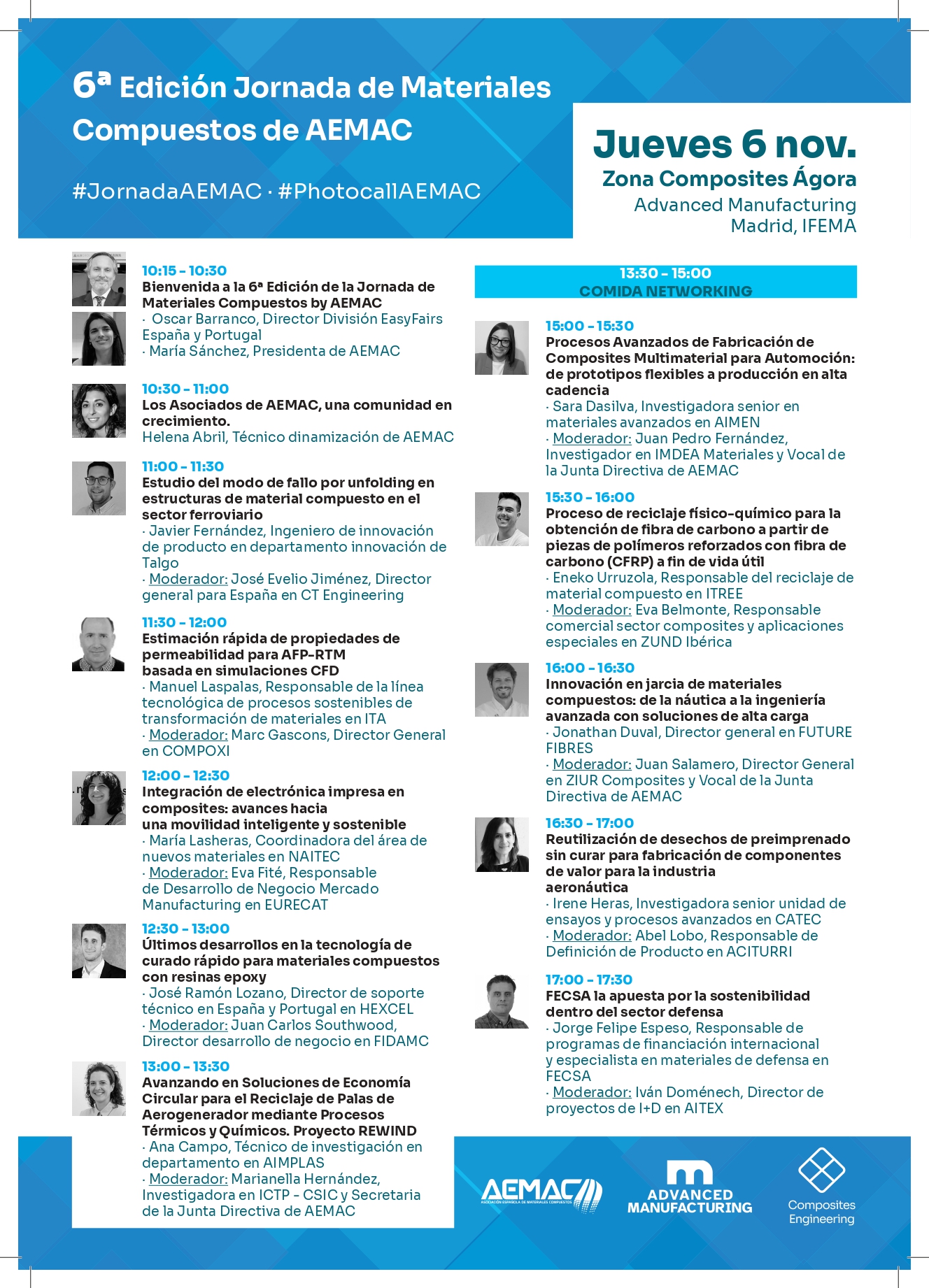 En esta edición participarán Asociados de AEMAC procedentes de la industria y la academia. Tras la bienvenida que correrá a cargo de la nueva Presidenta de AEMAC, María Sánchez, Catedrática en la Universidad Rey Juan Carlos y el Director de EasyFairs para España y Portugal, Oscar Barranco, se presentará la ponencia «Los Asociados de AEMAC, una comunidad en crecimiento» por Helena Abril, Técnico de Dinamización. A continuación, los asociados presentarán sus últimos desarrollos tecnológicos en el campo de los materiales compuestos, con la participación de la industria, de la mano de Javier Fernández de Talgo, moderado por José Evelio de CT Ingenieros, José Ramón Lozano de HEXCEL, moderado por Juan Carlos Southwood de FIDAMC, Eneko Urruzola de ITree, moderado por Eva Belmonte de ZUND Ibérica, Jonathan Duval de FUTURE FIBRES, moderado por Juan Salamero de ZIUR Composites y Jorge Felipe Espeso de FECSA, moderado por Iván Doménech de AITEX, y Airbus. Y desde la academia, con Manuel Laspalas de ITA, moderado por Marc Gascons de COMPOXI, María Lasheras de NAITEC, moderada por Eva Fité de EURECAT, Sara Dasilva de AIMEN, moderada por Juan Pedro Fernández de IMDEA Materiales e Irene Heras de CATEC moderada por Albel Lobo de ACITURRI.